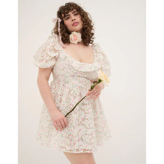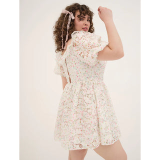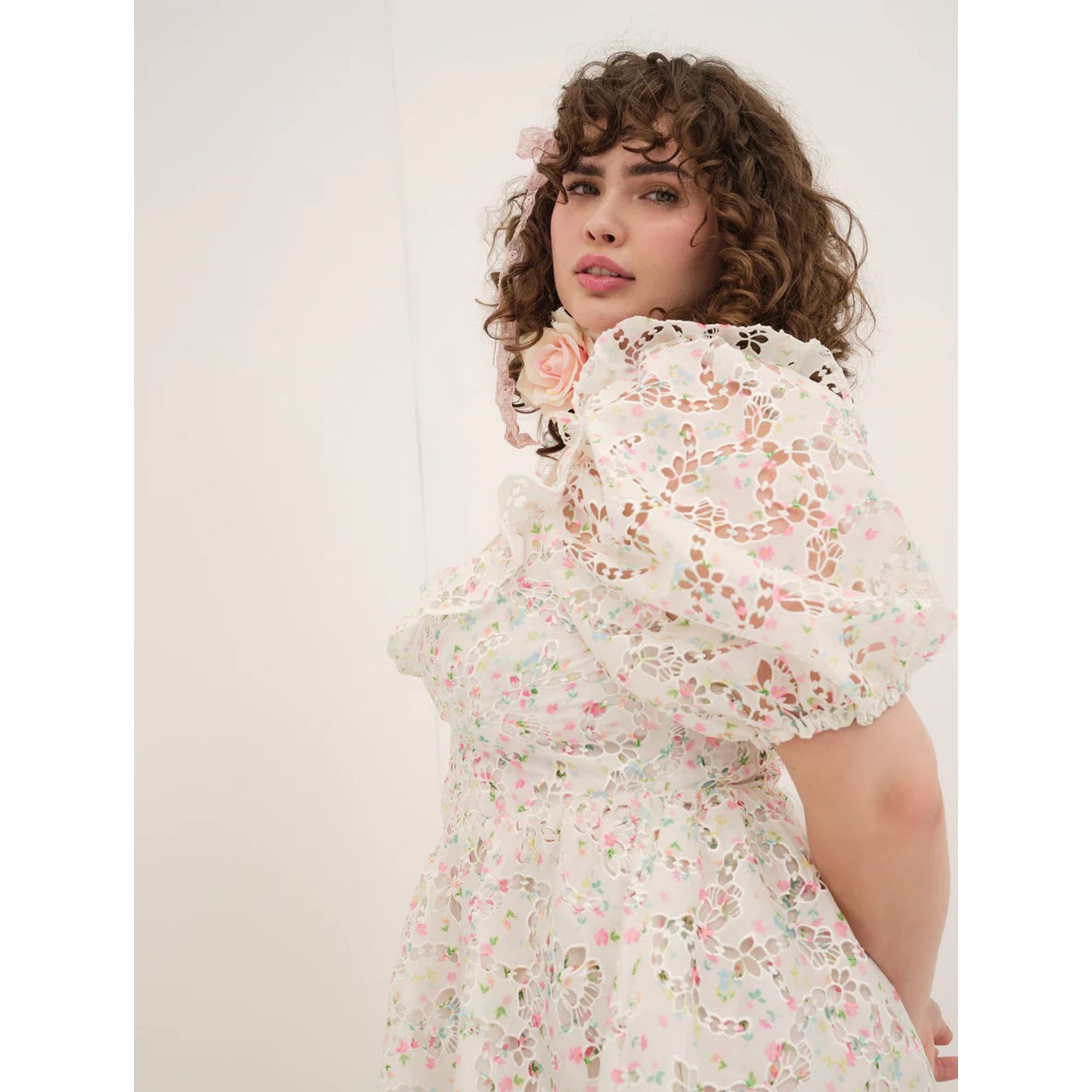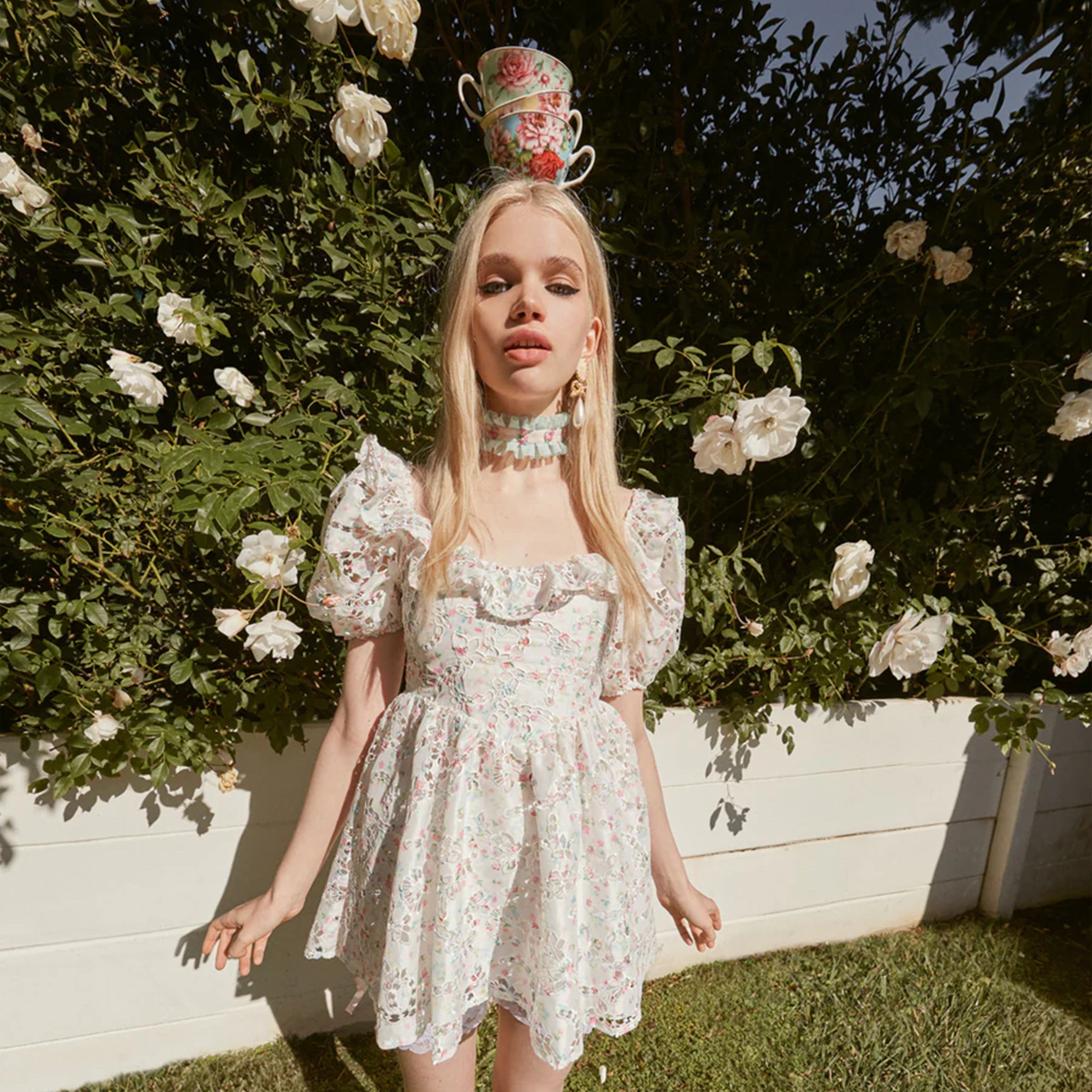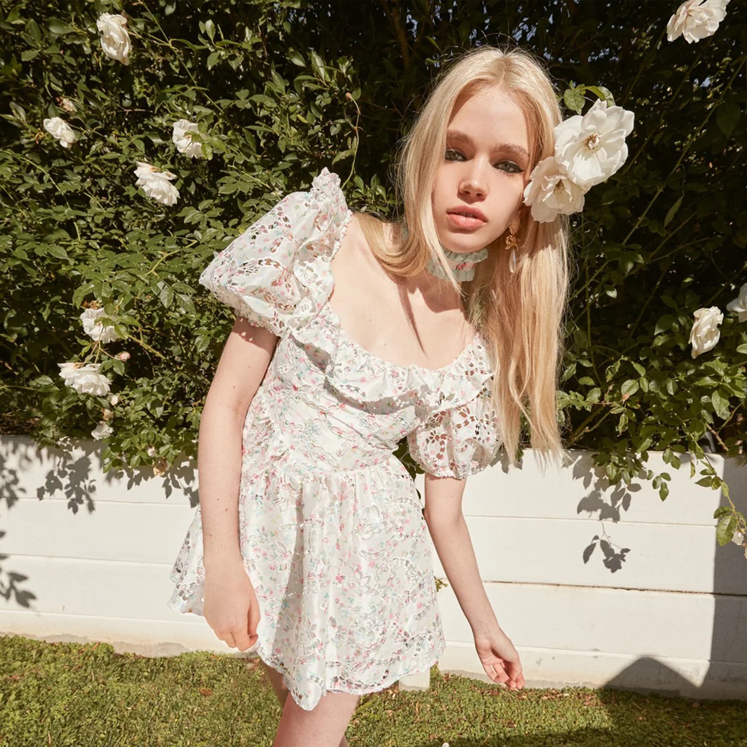 Laser-cut, printed taffeta has a unique, lacy look on For Love & Lemons' Magnolia Mini Dress. Complete with a wide scoop neckline with ruffle, puff sleeves, and a full, gathered skirt.
