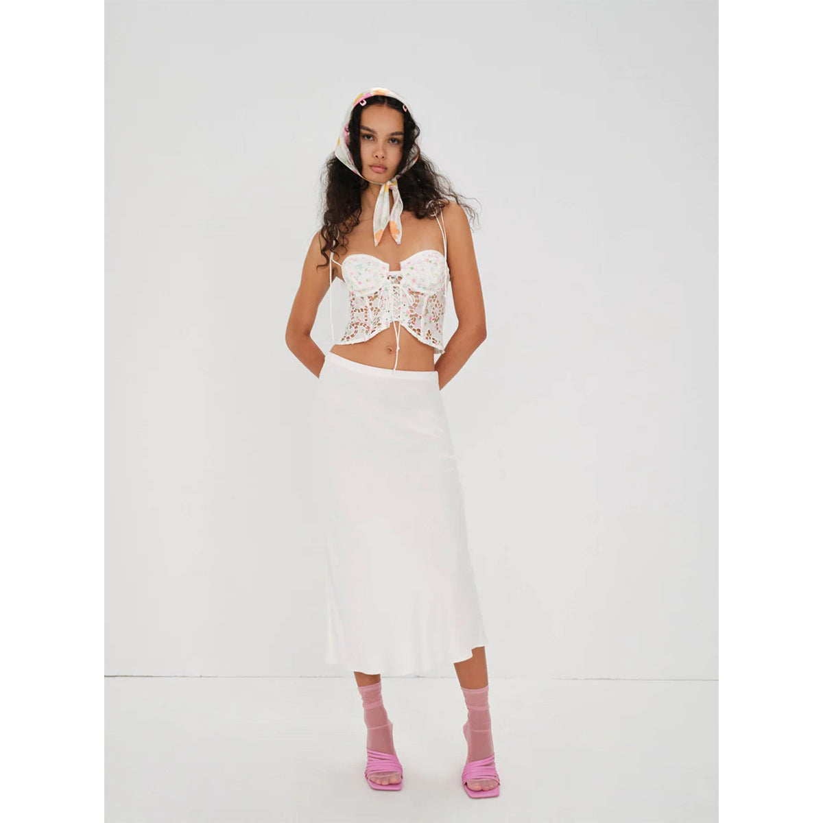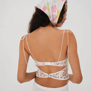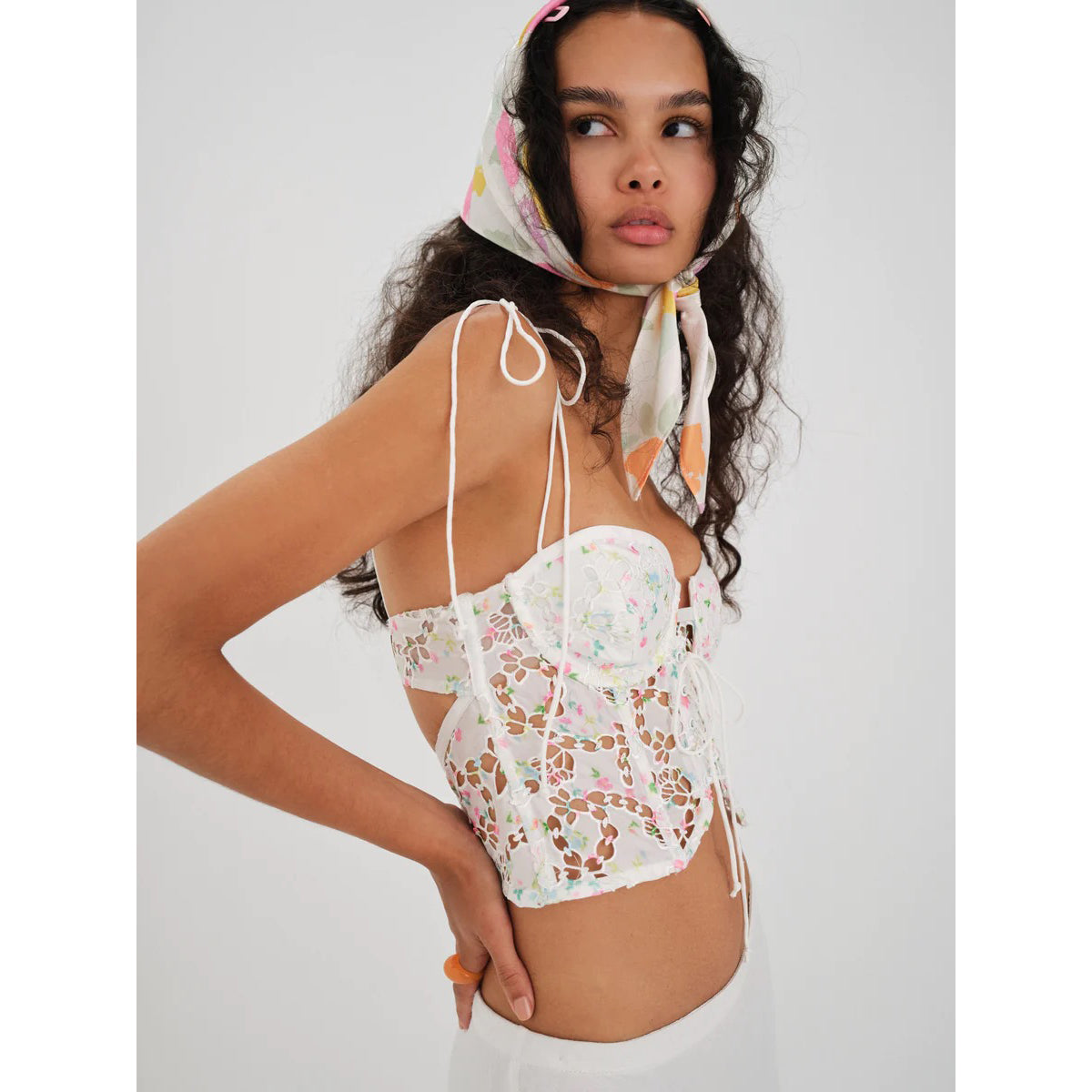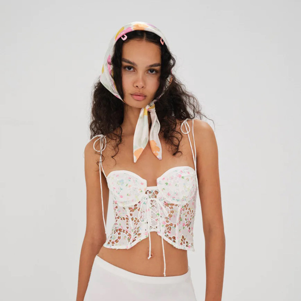 Lacy, laser cutwork on this printed taffeta top gives just a peak a what's beneath. For Love & Lemons' Kyra Crop Top features corset-syle lacing to add more interest, while a contrasting open-back design features two functional straps.