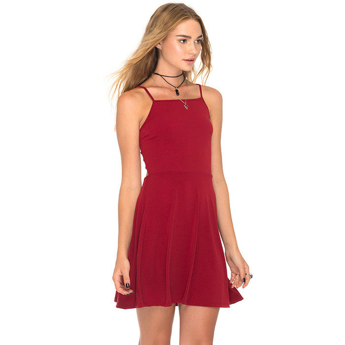 Red HOT. Motel Rocks' Luxe Dress comes in a breathtaking maroon hue with caged cutouts across the back. The high-neck skater silhouette makes for a flirty, girly mini, while the peek-a-boo back adds a little sex appeal.