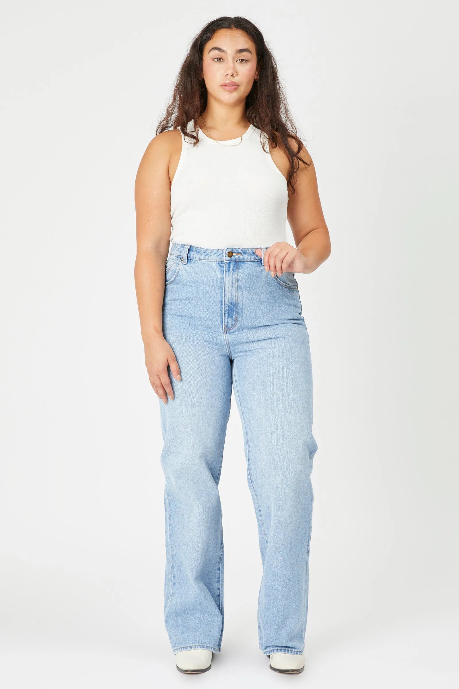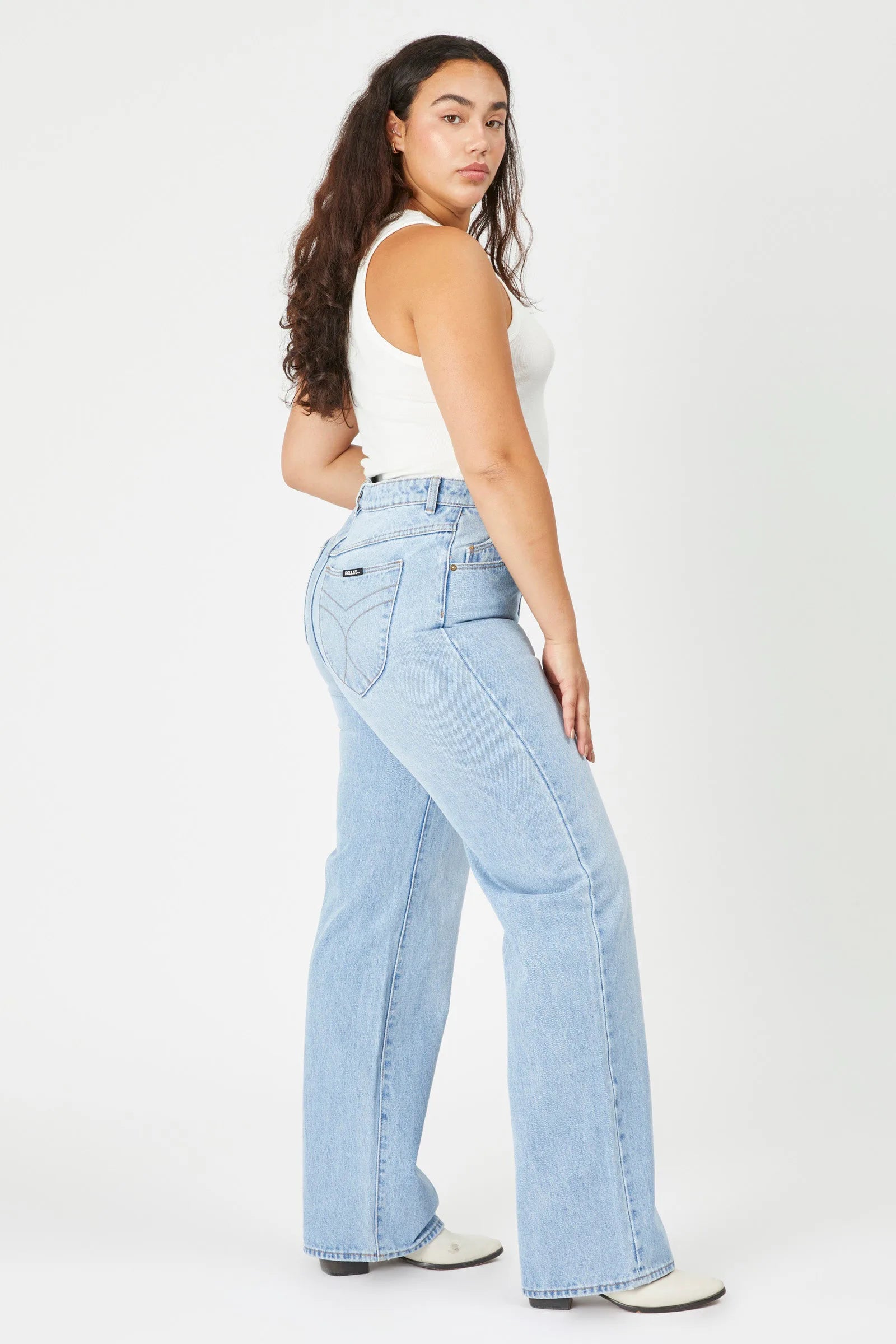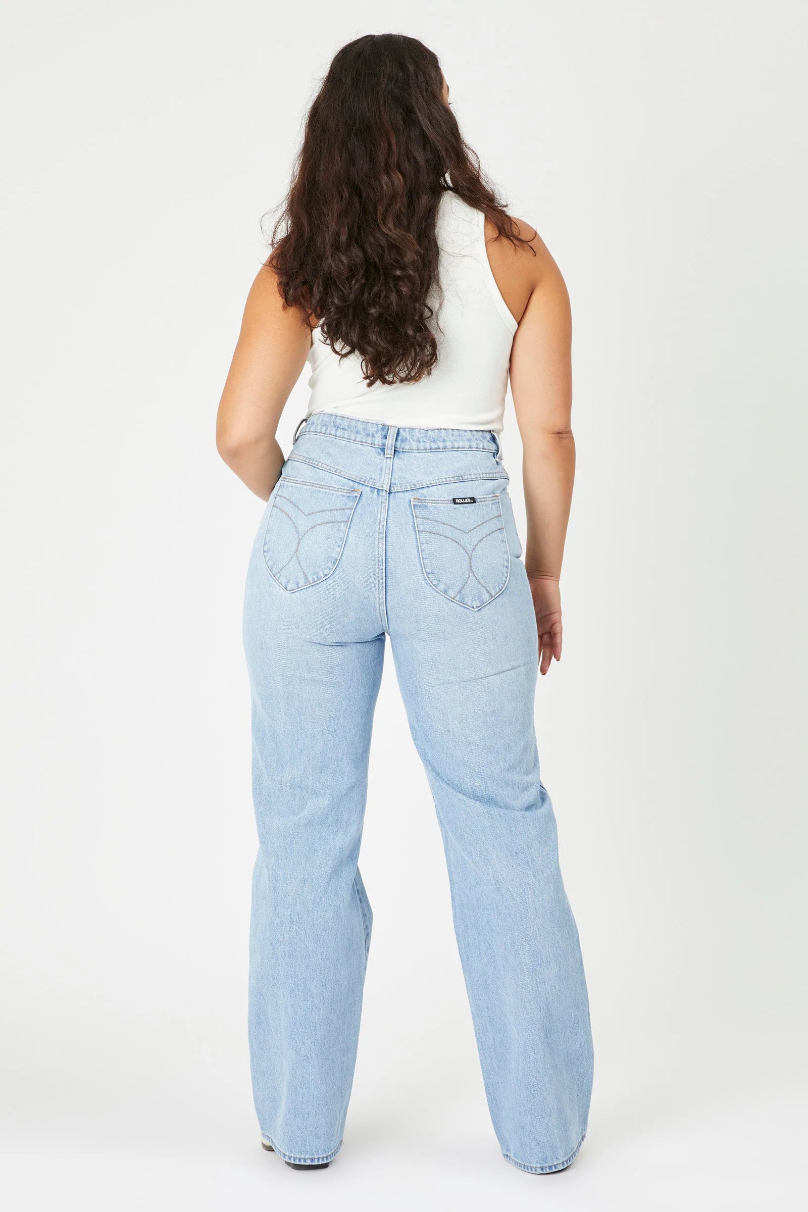 Rolla's Jeans' Heidi Jean in Old Stone is a high-rise, wide-leg jean made with rigid denim. We suggest sizing up.