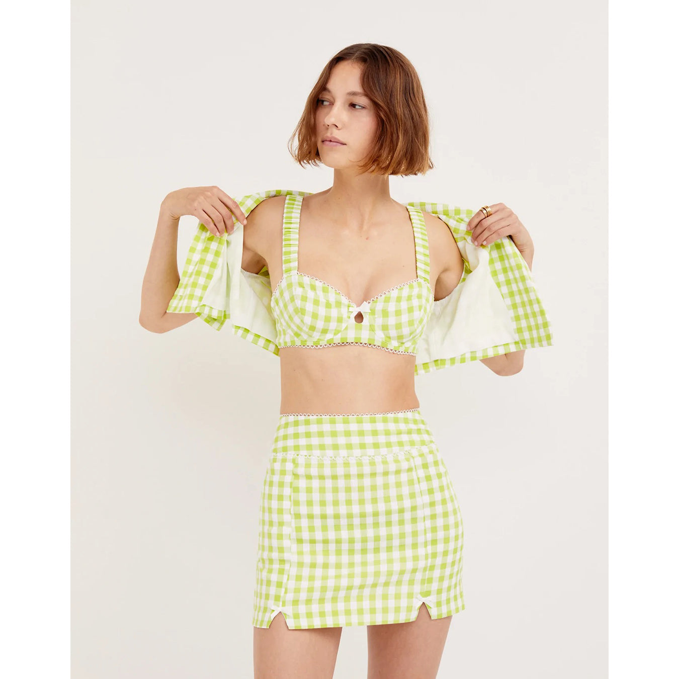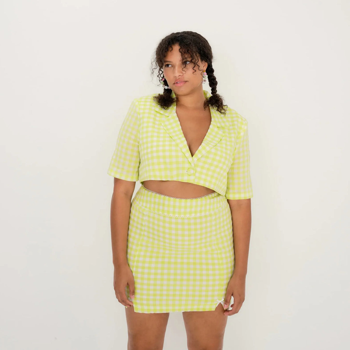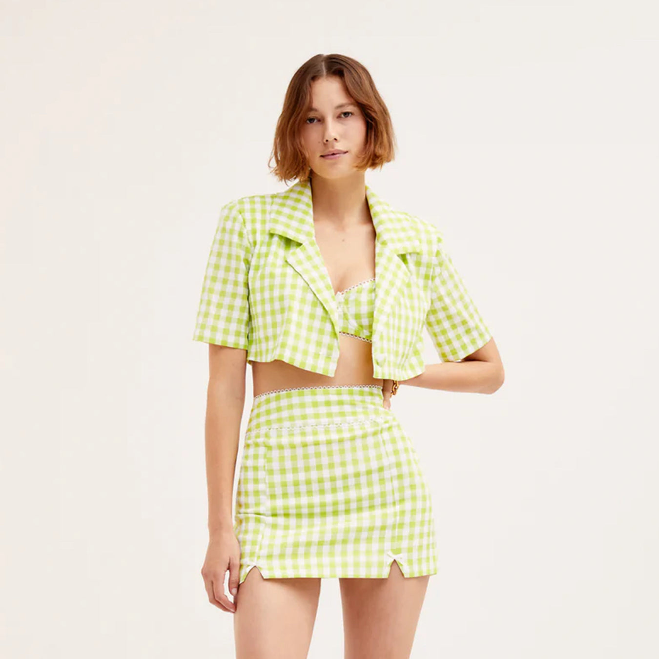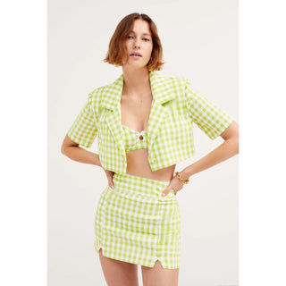 For Love & Lemons' Maureen Blazer Top is a Summery textured gingham crop top featuring a notch lapel and delicate white bows at sleeves. Pairs back with the Maureen Mini Skirt