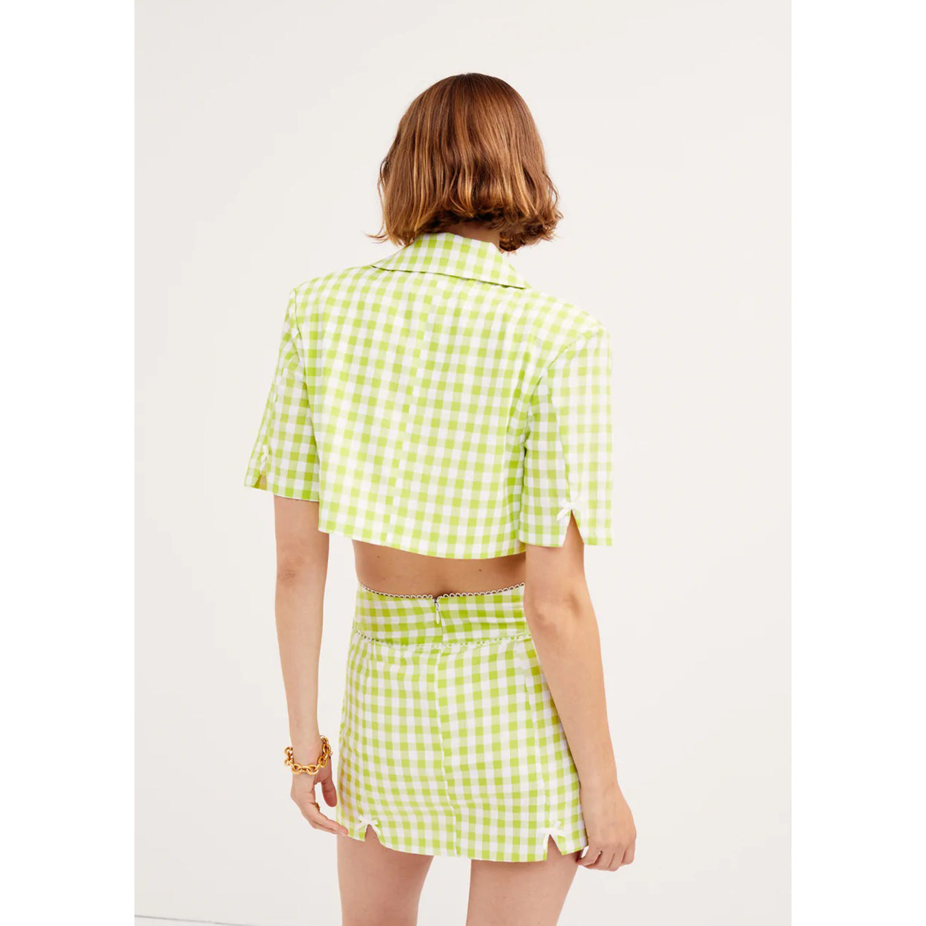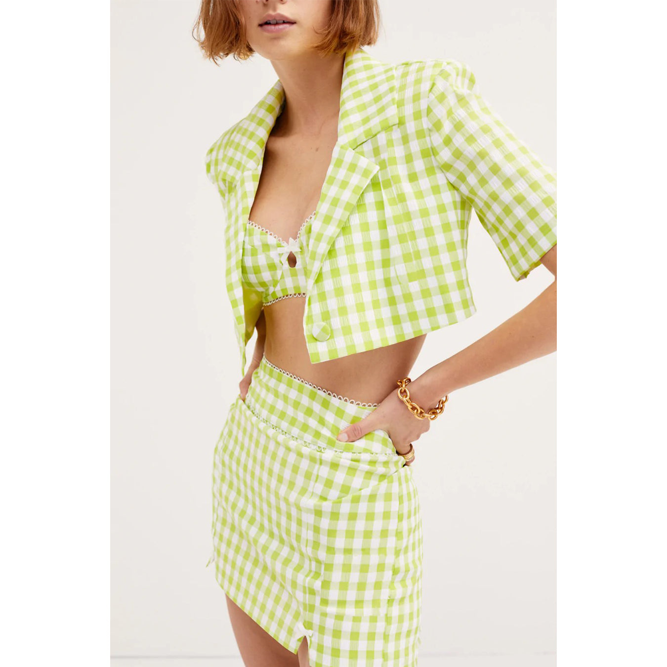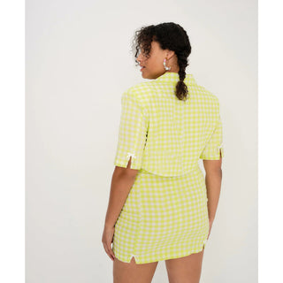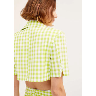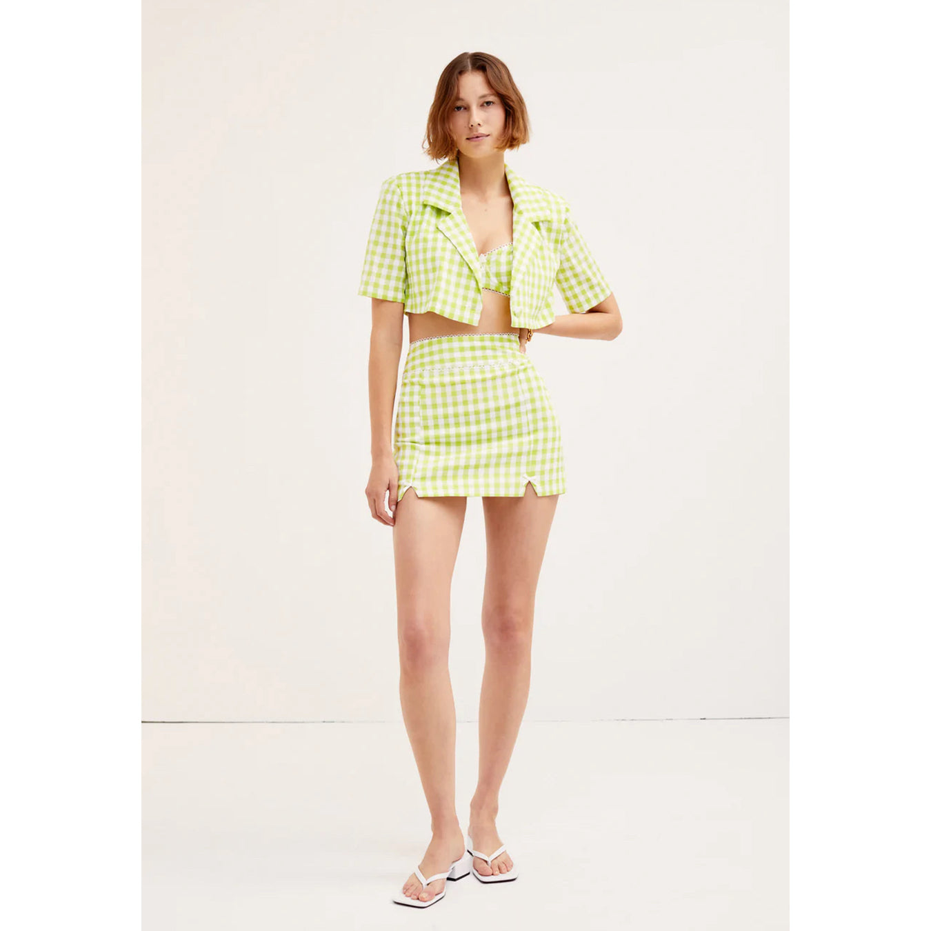 For Love & Lemons' Maureen Blazer Top is a Summery textured gingham crop top featuring a notch lapel and delicate white bows at sleeves. Pairs back with the Maureen Mini Skirt