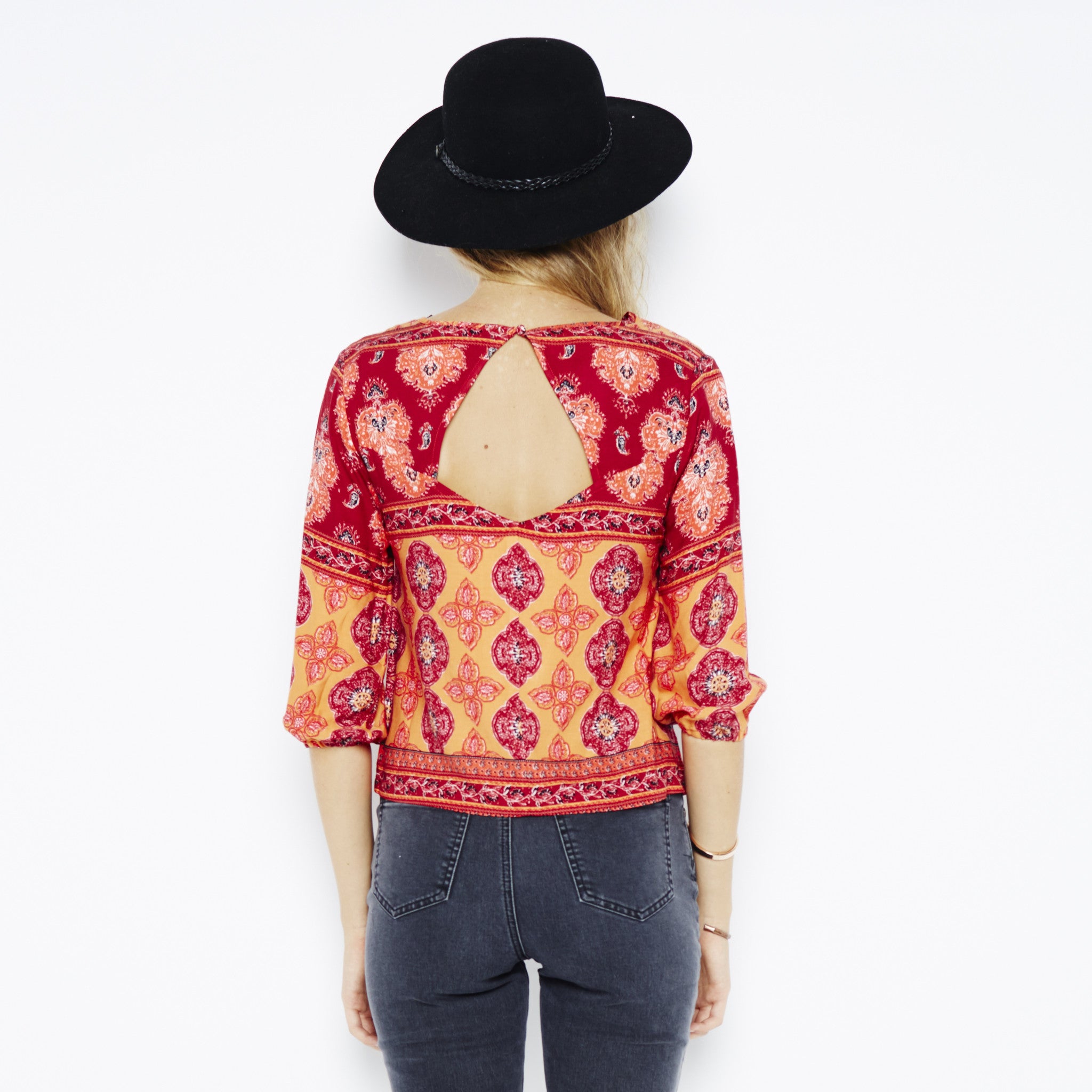 MINKPINK's gorg pink and orange-hued Folktale Blouse screams fall! A high neck strap detailing is featured on the front while a keyhole detail at the back adds a flirty feel to this 3/4 sleeve blouse!
